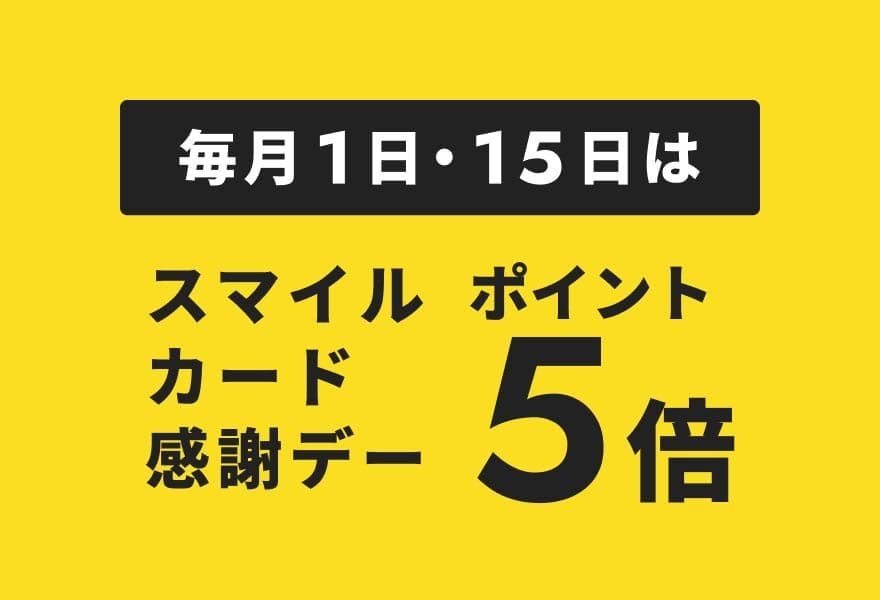スマイルカード会員様に日頃の感謝をこめて、毎月1日・15日はスマイルカード感謝デー!スマイルカード5倍ポイントとなります。皆様のご来店をお待ちしております。