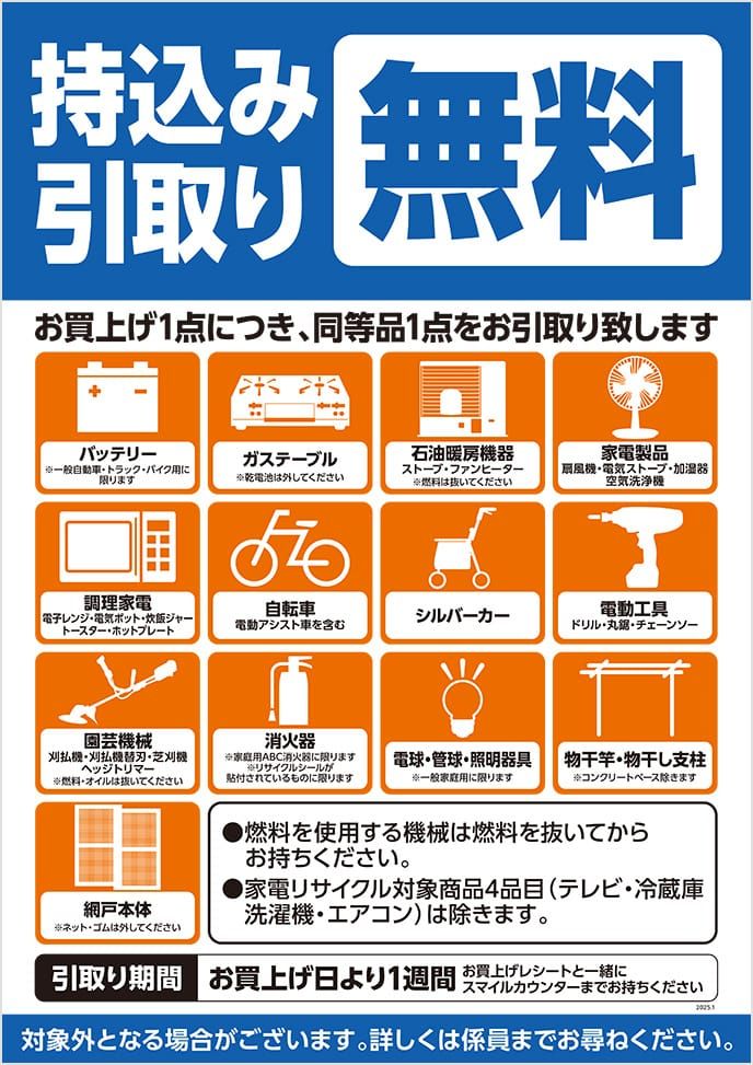 お買い上げ1点につき、同等品1点をお引取りいたします。