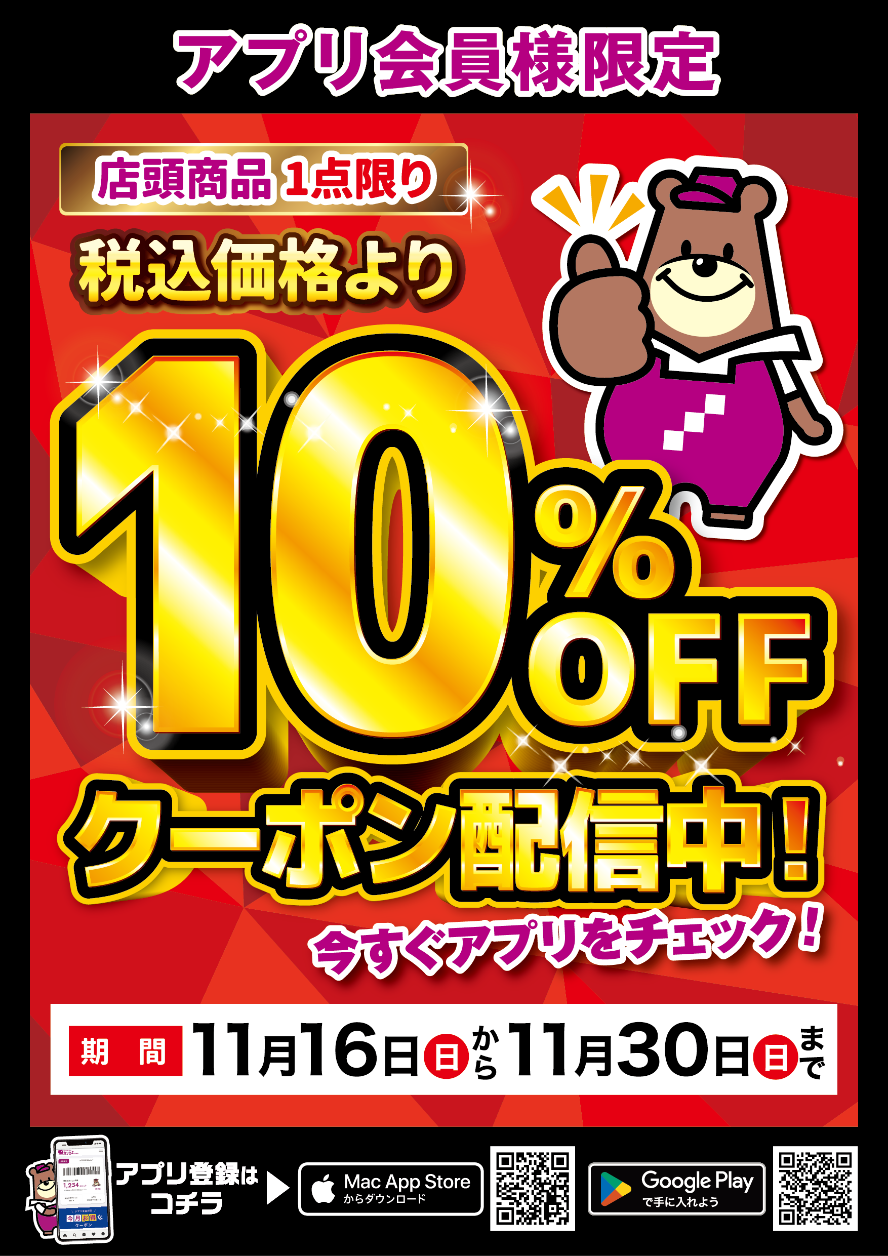 アプリ会員様限定☆ブラックフライデー10%OFFクーポン配信中!