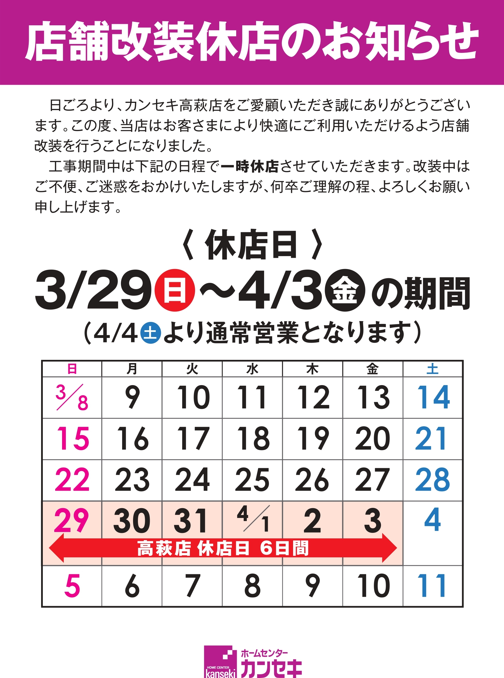 【改装休店日】2026年3月29日(日)~4月3日(金) 6日間