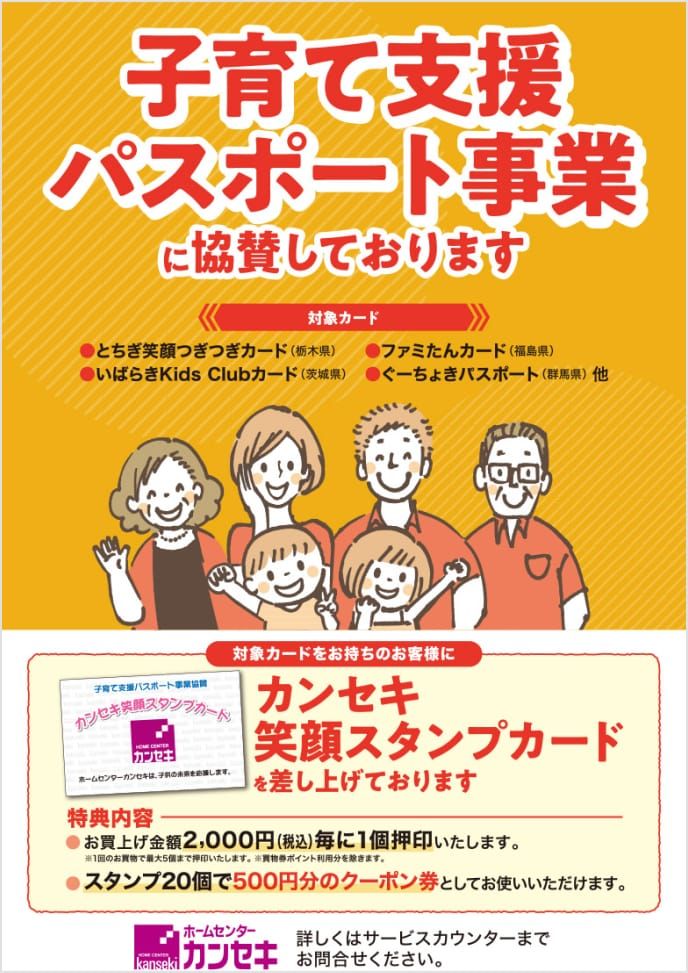 「子育て支援パスポート」をご提示いただきますと、カンセキ笑顔スタンプカードを進呈いたします。