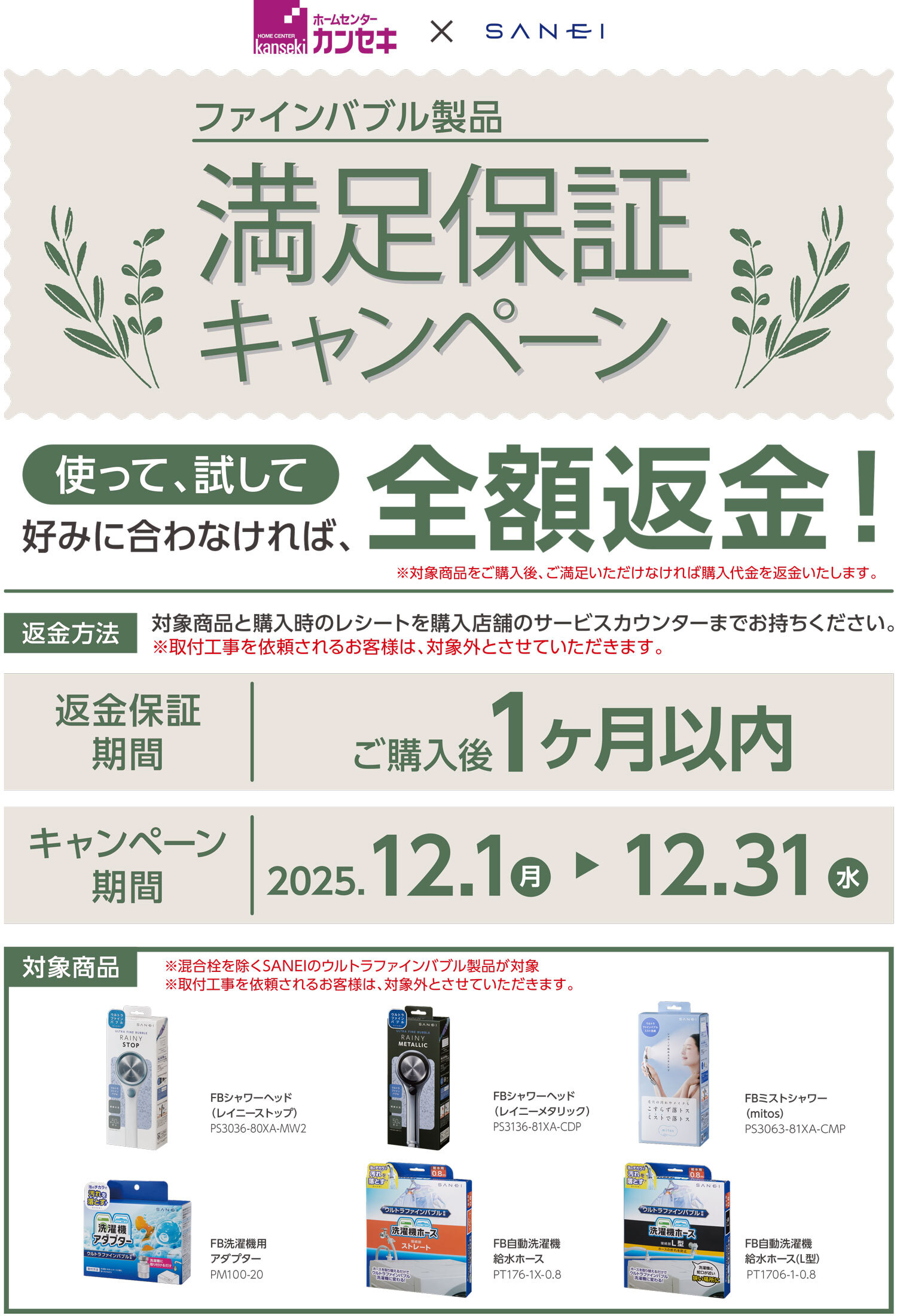 今がチャンス☆SANEI ファインバブル製品満足保証キャンペーンを開催♪