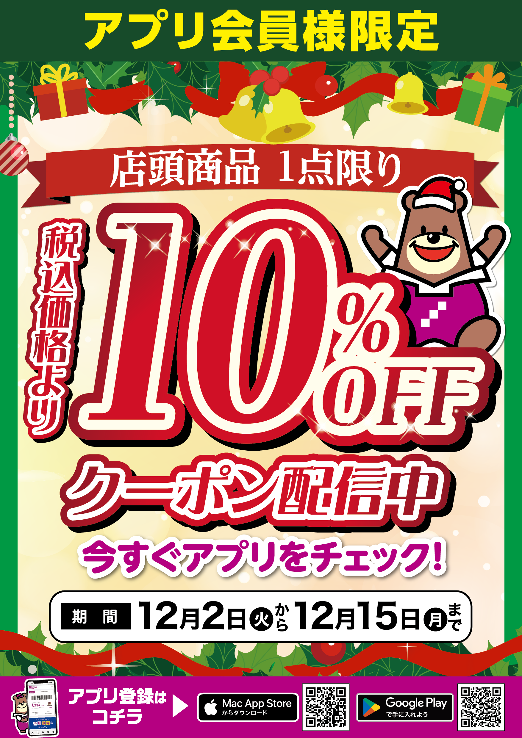 アプリ会員様限定☆クリスマス10%OFFクーポン配信中!