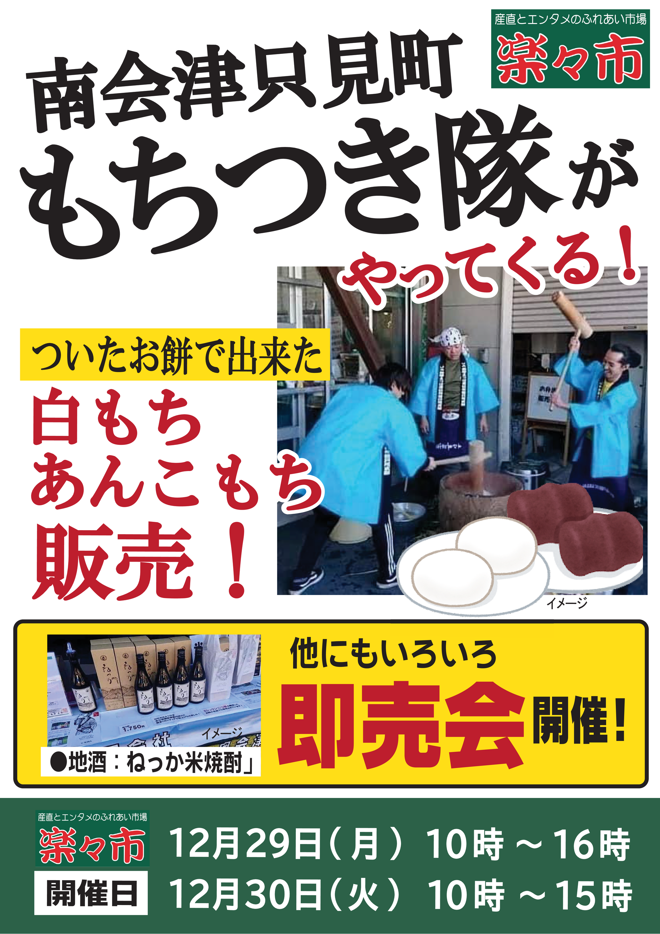 カンセキ駅東店に隣接する、産直とエンタメのふれあい市場「楽々市(らくらくいち)」に、福島県南会津より「只見町もちつき隊」がやってくる!