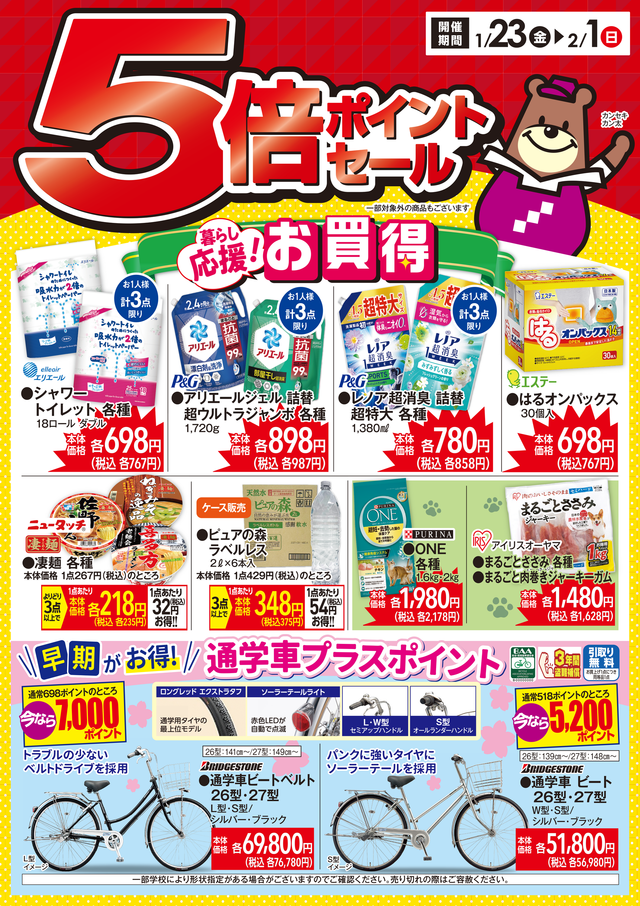 日用品やペットフードもポイント5倍!会員様限定、通学用自転車プラスポイントも同時開催中。当社指定通学車ご購入でポイントをプレゼント!この機会にぜひご来店ください。